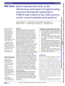 Ataiyero, Yetunde, Dube, Alisen, Odell, Joanne, Carter, Vanda, Smith, Hazel A., Hardy, Sally, Leary, Alison and Jones, SarahJane (2025) Quasi-experimental study on the effectiveness and impact of implementing nurse-led 'therapeutic optimisation' (THEO) intervention in two older persons wards: A mixed methods study protocol. BMJ Open, 15 (8). ISSN 2044-6055