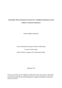 Alhumaidhi, Khalid Abdullah (2025) Subscription Video-on-Demand in Everyday Life: A Qualitative Exploration of Saudi Audiences’ Interpretive Repertoires. Doctoral thesis, University of East Anglia.