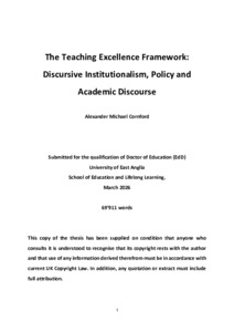 Cornford, Alexander (2026) The Teaching Excellence Framework: Discursive Institutionalism, Policy and Academic Discourse. Doctoral thesis, University of East Anglia.