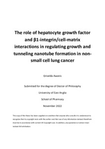Awanis, Griselda (2022) The role of hepatocyte growth factor and β1-integrin/cell-matrix interactions in regulating growth and tunneling nanotube formation in non-small cell lung cancer. Doctoral thesis, University of East Anglia.