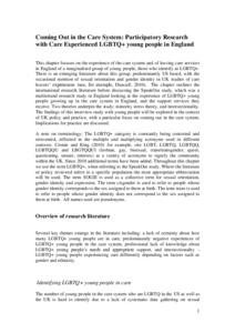 The chapter focuses on the experience of the care system and of leaving care services in England of LGBTQ+ young people. The existing, mostly US, literature base suggests that LGBTQ young people may experience prejudice and have poorer outcomes than their heterosexual cisgender counterparts. The chapter outlines the international research literature before discussing the SpeakOut study, which was a multistrand research study in England looking at the experience of LGBTQ+ young people growing up in the care system in England, and the support services they receive. In particular, it focuses on the findings of life history interviews conducted with 46 LGBTQ+ young people aged 11- 26 with more than six months care experience. The interviews were recorded, transcribed and anonymized. Thematic analysis was used to analyse the data. Key findings included widespread experiences of stigma in relation to sexual orientation, gender identity and being in care. Experiences of one type of stigmatization led young people to be wary about sharing other aspects of their identities. Many young people who wanted to come out whilst living in care, were vigilant about the possibility of further rejection, having already experienced loss and separation from birth families. For a minority of young people growing up in care provided a safe space to explore sexual orientation or gender identity, although several reported that they did not feel safe to explore gender identity until they were at the point of leaving care. Practitioners need to be aware of both the benefits and risks of coming out in the care system and be able to advise and prepare young people for this. In order for this to be possible practitioners need to be accepting, knowledgeable and confident about the experiences of LGBTQ+ young people and the particular context of the care system.