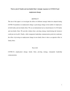 The aim of this paper is to investigate the effects of different strategic behaviors adopted during COVID-19 pandemic on employment change (a percentage change in the number of employees) in both family and non-family firms. We use an international survey-based dataset of 2,192 family and non-family firms. We provide evidence that a pivoting strategy (transforming the business) could prevent layoffs. Finally, while transparent leadership communication positively moderates the effect of pivoting on employment change in non-family firms it shows an opposite effect in family firms.