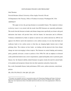This paper reviews the growing literature on sustainable finance. The empirical evidence on the key issues is very mixed with the results from ESG literature are especially problematic. The results from the literature on banks and climate change more specifically are clearer with good indications that banks will provide firms with the finance for innovation and its diffusion. Voluntary commitments by banks to operate to reach net zero carbon emissions by 2050 do not appear to be effective and in the transition to a low carbon economy it is not clear that banks are reallocate funds to low carbon sectors or that they are charging higher interest rates to high polluting firms. The evidence on how banks are dealing with the physical risks from climate change are more encouraging in these respects. The literature on central banking and monetary policy generally advocates a return to policies of the 1950s-70s with an emphasis on directed credit, preferential interest rates, reserve requirements, capital and liquidity ratios to promote green finance, but the financial stability-related literature recognizes clearly the need for central banks to be prudent and incorporate climate risks into their operations and policy frameworks.
